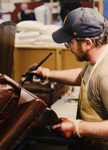 In our Lancashire workshop, master craft-people, trained for years in the art of leather, create one-of-a-kind finishes for our hand antiqued leathers. This meticulous process reveals depth of tone and texture that cannot be replicated by machine, giving every sofa its own unique personality.