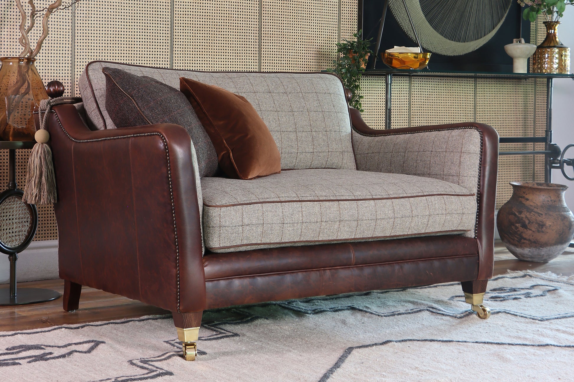 A classic look sofa, the Balmoral features finial detailing on the back of the arms and sits on beautiful brass castors. Available in all over fabric of fabric with a leather trim, this collection features three sizes of sofa and a snuggler.