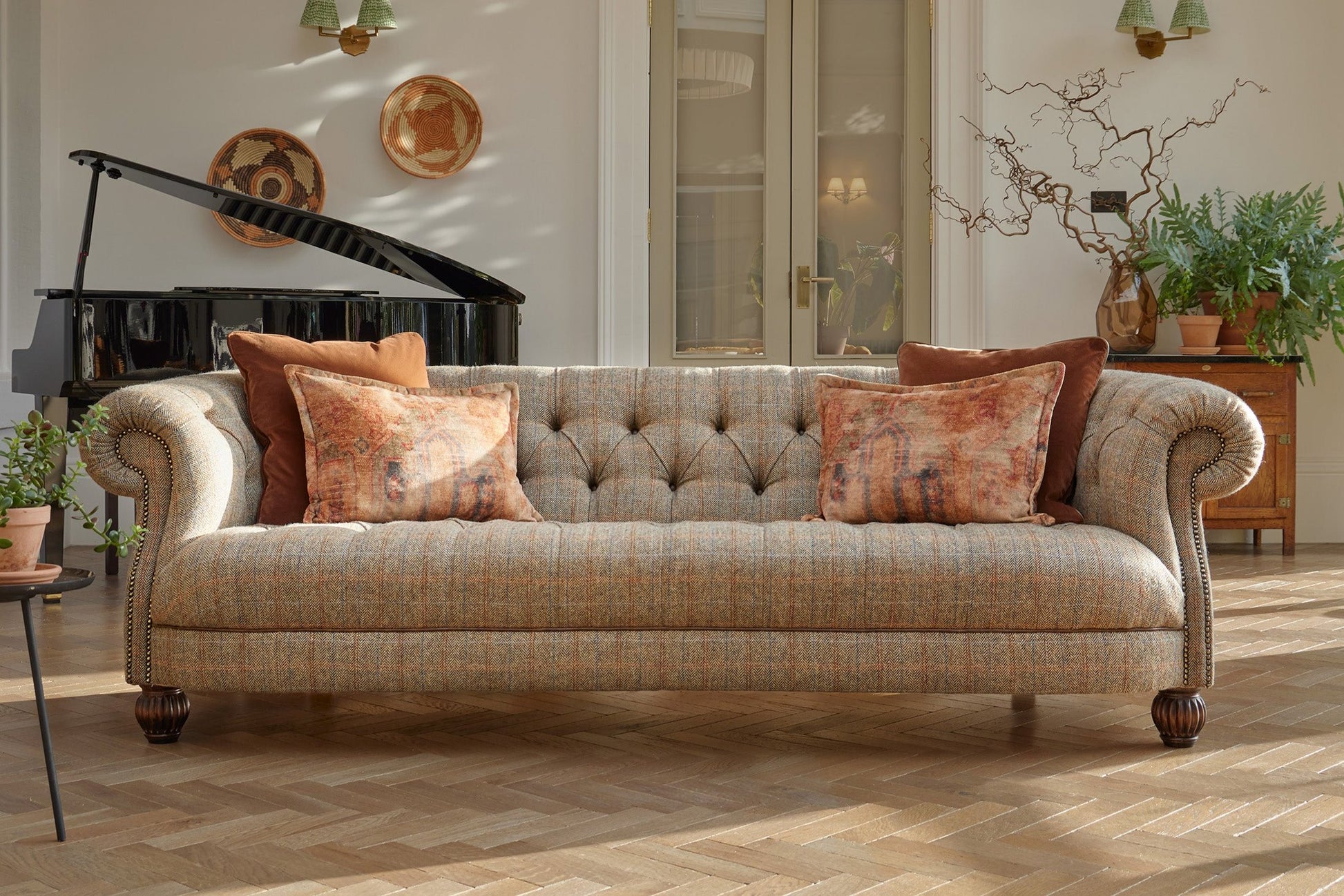 A traditional style chesterfield, with all over deep-button detailing, a deep sprung seat and hand studded scroll arms. The Caledonian collection is available in all over Harris Tweed, leather or Heritage fabric. The collection is available in four sizes of sofa and a stool.