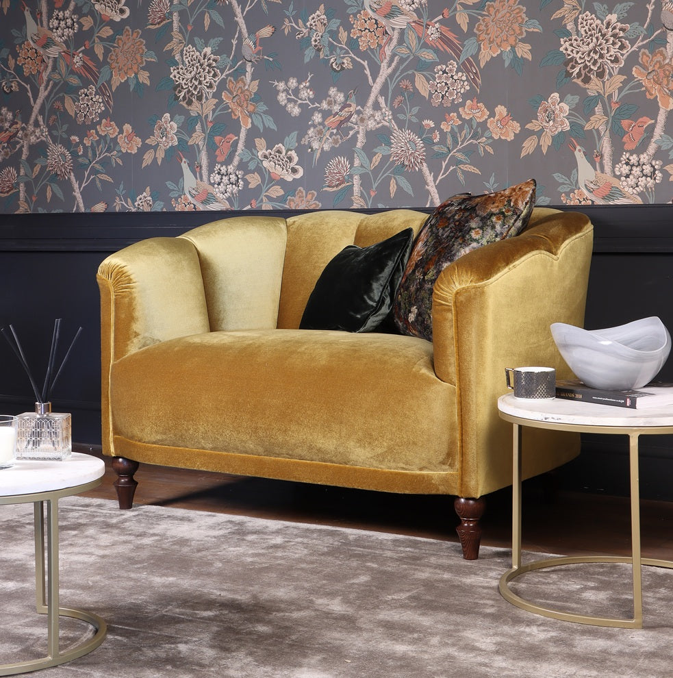 The fixed seat is fully pocket sprung and the webbed back is defined by an intricate fluted detail. Turned hardwood legs complete the sophisticated design.